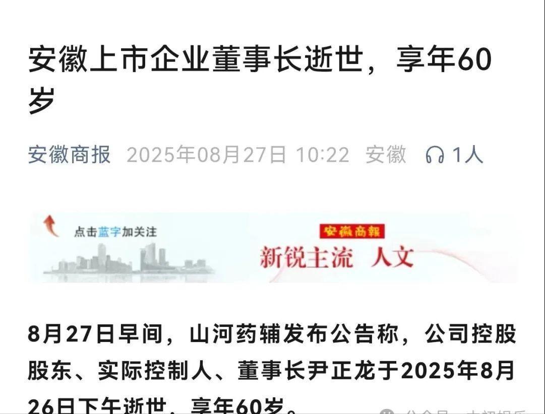 8月27日,山河药辅正式发布讣告,向公众通报了这一悲痛事实。